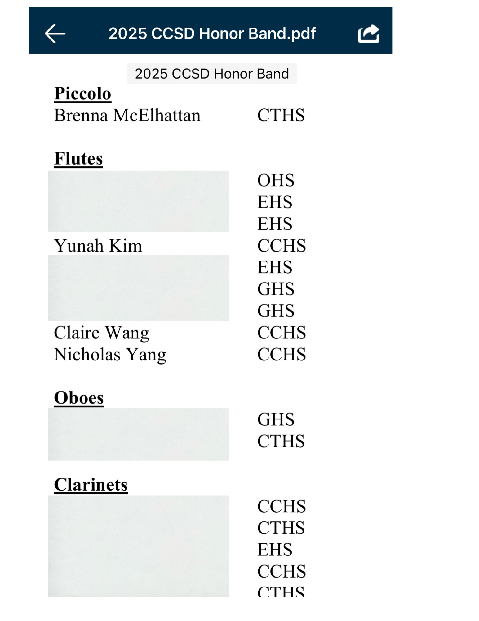 Congratulations to Emily Zhang, who earned placement in the Cherry Creek School District Middle School Honor Band 2026 after only 3 months since she started to learn the flute, outperforming peers with years of experience. So proud of you!