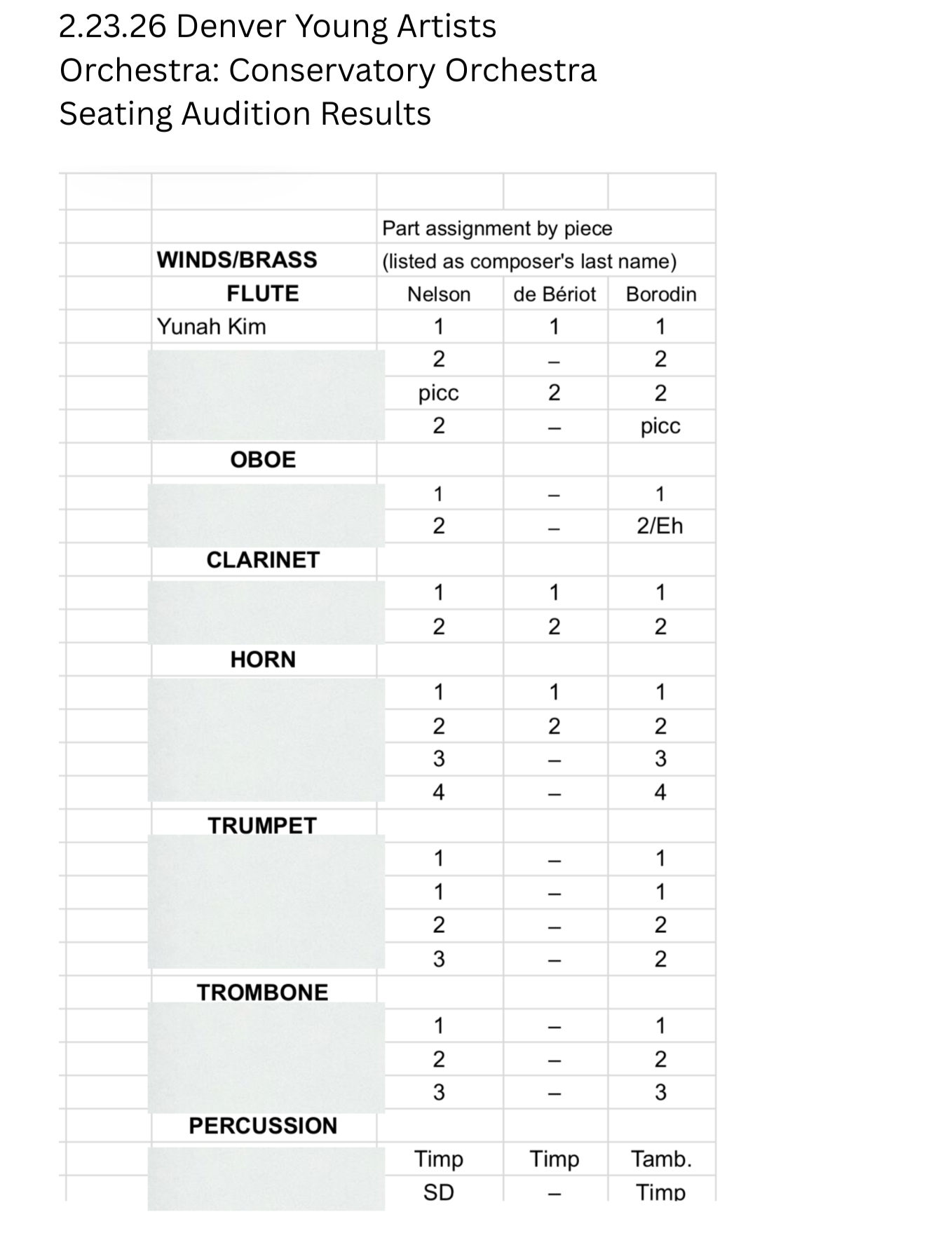 Congratulations to Yunah Kim for being selected as First Chair Flute in the Conservatory Orchestra of the Denver Young Artists Orchestra for all repertoire this season. Yunah has also held the First Chair position in past seasons.